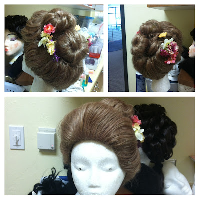 I was asked to be the head hairstylist for "Mikado" a production the Theatre Department at BYU-I is putting on right now. So, for the last two weeks I have done lot's of hair. I spent over four hours on just these two wigs below. I designed, and styled both of them. It was really challenging considering they are synthetic so, you can't do much to fix them. Then I also do 3-4 different girls hair each night of the production. IT'S AWESOME! It's what I love to do! So, now I am doing quite a bit and it's pretty awesome! I am so blessed!